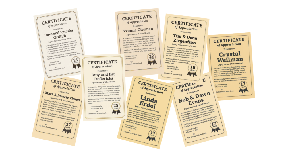 The Kennels of Stone Creek offers the following discounts: A $1.00 a day discount per dog with cash payment.